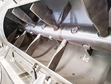 1.主机动力分配采用高转速,高扭矩的分配箱。承载能力强,噪音指标低,效率高。物料调质采用三轴桨叶调质器,设计多个液体、蒸汽添加口,保证物料的均匀调质,提高鲜肉添加比例和熟化效果。