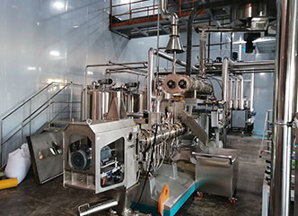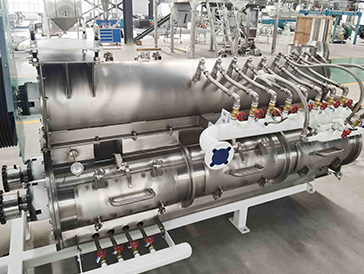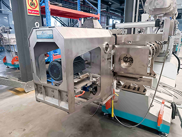 1.主机动力分配采用高转速,高扭矩的分配箱。承载能力强,噪音指标低,效率高。物料调质采用三轴桨叶调质器,设计多个液体、蒸汽添加口,保证物料的均匀调质,提高鲜肉添加比例和熟化效果。