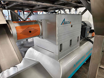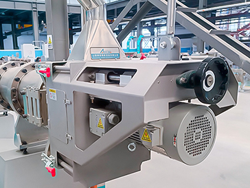 1.主机动力分配采用高转速,高扭矩的分配箱。承载能力强,噪音指标低,效率高。物料调质采用三轴桨叶调质器,设计多个液体、蒸汽添加口,保证物料的均匀调质,提高鲜肉添加比例和熟化效果。